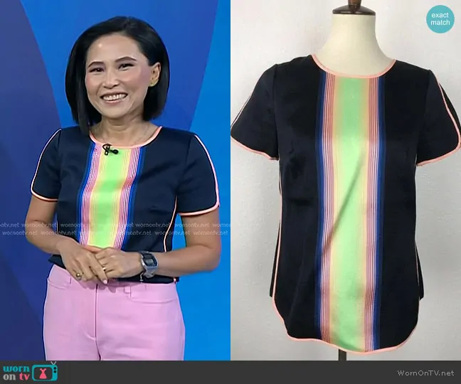 Vicky Nguyen on Today on NBC was spotted wearing this navy striped top and pink pants on Today on Sep 30 2024's episode. Vicky's Top is the Striped Color Block Silk Blend Top by J. Crew . Vicky's Pants is the Blair Wide Leg Pants by Reiss.