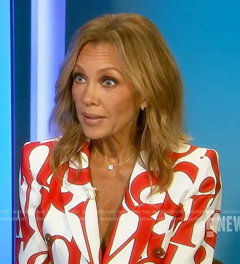 on E! News on E! was spotted wearing this white and red printed blazer on E! News on Oct 01 2024's episode. 's Blazer is the Allover Logo Printed Double-Breasted Blazer by Vivienne Westwood.