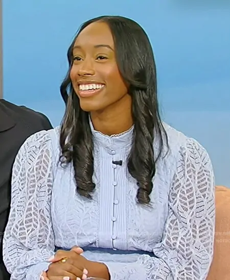 on Tamron Hall Show on ABC was spotted wearing this blue lace dress on Tamron Hall Show on Oct 01 2024's episode. 's Dress is the Remy Mini Dress by Bardot.