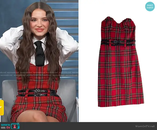 on Access Hollywood on NBC was spotted wearing this red tartan check belted dress on Access Hollywood on Oct 01 2024's episode. 's Dress is the Tartan Double Belted Strapless Mini Dress by Betsey Johnson . 's Shoes is the The Bianca Patent Block Heel Pumps by M. Gemi.