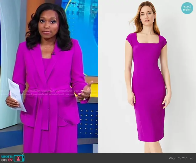 Rachel Scott on Good Morning America on ABC was spotted wearing this purple dress and tie waist blazer on Good Morning America on Jun 26 2025's episode. Rachel's Dress is the Square Neck Cap Sleeve Sheath Midi Dress in Vibrant Magenta by Ann Taylor . Rachel's Jacket is the Crepe Belted Blazer in Vibrant Magenta by Ann Taylor.