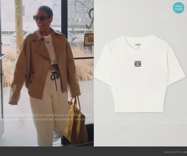 Jessel Taank on The Real Housewives of New York City on Bravo was spotted wearing this beige double breasted jacket and top on The Real Housewives of New York City on episode 'Apple of My Lie' (15x01) in Oct 2024. Jessel's Top is the Anagram cropped embroidered ribbed cotton T-shirt by Loewe . Jessel's Jacket is the Balloon Double-Breasted Jacket by Loewe . Jessel's Sunglasses is the Wing aviator sunglasses by Loewe.