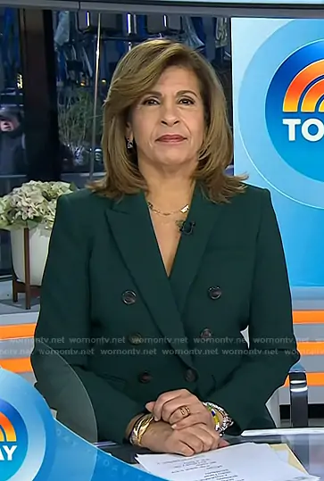 Hoda Kotb on Today on NBC was spotted wearing this green blazer and cropped pants on Today on Feb 10 2026's episode. Hoda's Jacket is the Miller Dickey Jacket in Pine by Veronica Beard . Hoda's Pants is the Arte Pants in Pine by Veronica Beard.