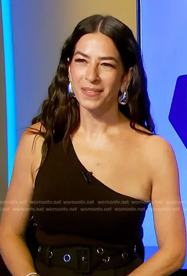 on E! News on E! was spotted wearing this Rebecca Minkoff’s black one-shoulder top and belted pants on E! News on Oct 02 2024's episode. 's Bodysuit is the Bonnie One-Shoulder Bodysuit by Rebecca Minkoff . 's Pants is the Wool Blend Wide Leg Pants by Rebecca Minkoff . 's Earrings is the Large Drop Earrings in Argento by Bottega Veneta.