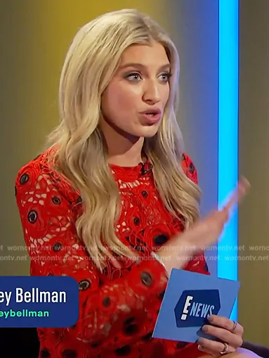 on E! News on E! was spotted wearing this red floral crochet knit top and skirt on E! News on Oct 02 2024's episode. 's Top is the Nori Embroidered Lace Long-Sleeve Top by Milly . 's Skirt is the Embroidered Floral Lace Mini Skirt by Milly.