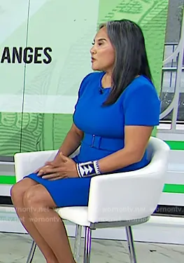 on Today on NBC was spotted wearing this blue belted dress on Today on Oct 03 2024's episode. 's Dress is the Dress with Self Buckle by Calvin Klein.