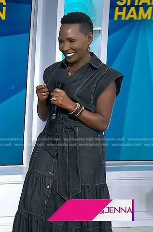 on Today on NBC was spotted wearing this denim dress on Today on Oct 04 2024's episode. 's Dress is the Daria Midi Dress in black by Elan.