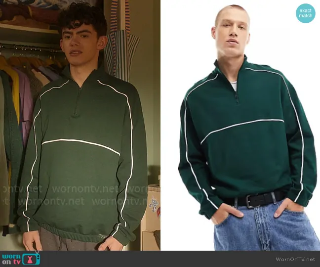 Charlie Spring (played by Joe Locke) on Heartstopper on Netflix was spotted wearing this green pullover with white piping on Heartstopper on episode 'Body' (3x06) in Oct 2024. Charlie's Sweatshirt is the Oversized half zip sweatshirt with piping in dark green by ASOS Design.