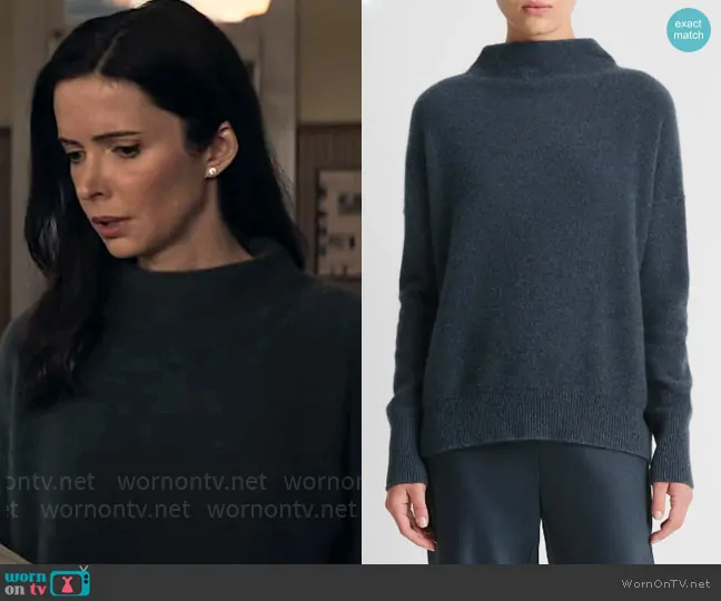 Lois Lane (played by Elizabeth Tulloch) on Superman and Lois on The CW was spotted wearing this dark funnel-neck sweater on Superman and Lois on episode 'The End & The Beginning (1)' (4x01) in Oct 2024. Lois's Sweater is the Boiled Cashmere Funnel Neck Pullover in Heather Tide Stone by Vince.