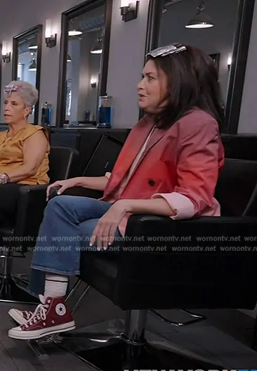 on The Drew Barrymore Show on CBS was spotted wearing this pink ombre blazer on The Drew Barrymore Show on Oct 07 2024's episode. 's Blazer is the Viva Blazer by Misa Los Angeles . 's Shoes is the Chuck 70 by Converse.