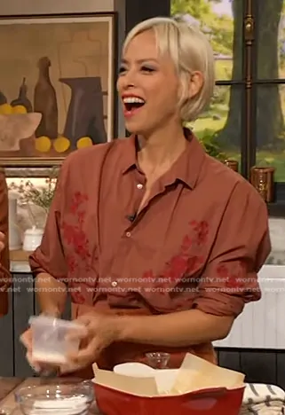 on The Drew Barrymore Show on CBS was spotted wearing this brown embroidered shirt on The Drew Barrymore Show on Oct 09 2024's episode. 's Top is the Alice Shirt in Clay Teacup Floral by Caron Callahan.