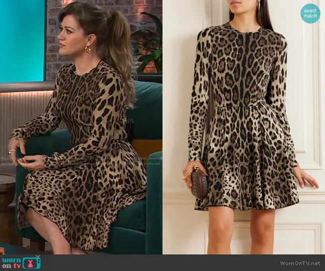 Kelly Clarkson on The Kelly Clarkson Show on NBC was spotted wearing this beige leopard print dress on The Kelly Clarkson Show on Oct 09 2024's episode. Kelly's Dress is the Leopard-print Stretch-satin Mini Dress by Dolce & Gabbana.