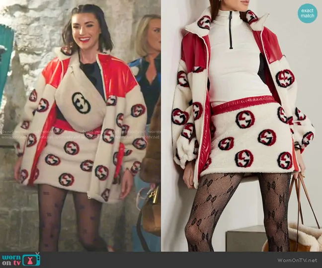 Bronwyn Newport on The Real Housewives of Salt Lake City on Bravo was spotted wearing this white print fleece jacket and mini skirt on The Real Housewives of Salt Lake City on episode 'The Epiphany' (5x04) in Oct 2024. Bronwyn's Jacket is the Shell Trimmed Wool-fleece Jacquard Jacket by Gucci . Bronwyn's Skirt is the GG Wool-fleece Jacquard Skirt by Gucci . Bronwyn's Bag is the Leather-Trimmed Logo-Jacquard Shearling Belt Bag by Gucci . Bronwyn's Shoes is the Icon Logo Snow boots by Moon Boot.