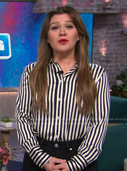 Kelly Clarkson on The Kelly Clarkson Show on NBC was spotted wearing this striped shirt on The Kelly Clarkson Show on Oct 10 2024's episode. Kelly's Top is the Striped Shirt by H&M.