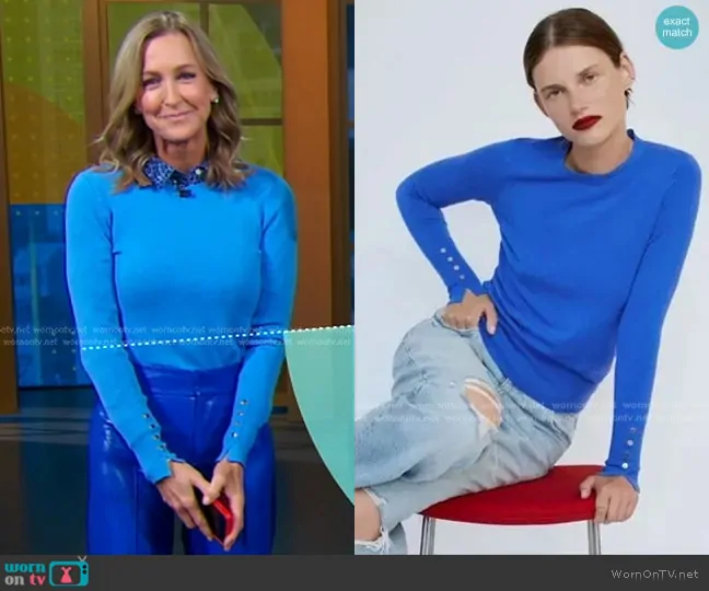 Lara Spencer on Good Morning America on ABC was spotted wearing this blue button cuff sweater and leather pants on Good Morning America on Oct 10 2024's episode. Lara's Sweater is the Basic Knit Sweater by Zara . Lara's Pants is the Dylan Vegan Leather Wide-Leg Pants in Royalty by Alice + Olivia.