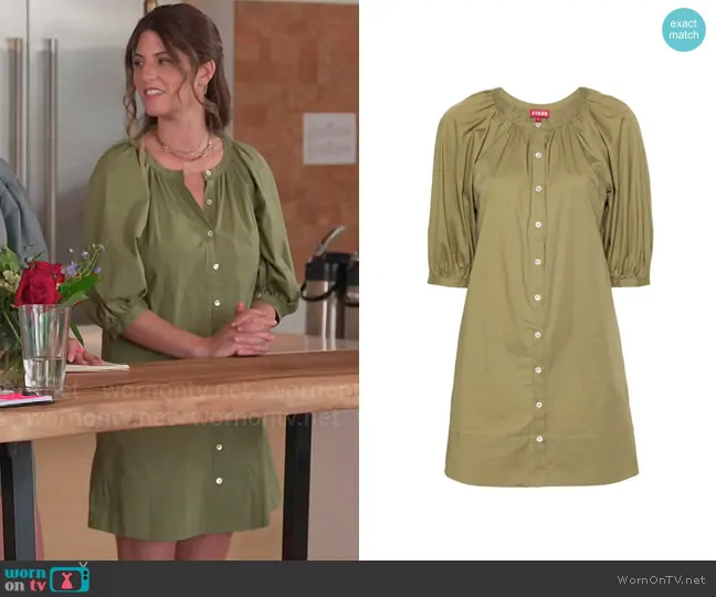 Marisa Lainer on Celebrations with Lacey Chabert on Hallmark was spotted wearing this green button front dress on Celebrations with Lacey Chabert on episode 'Justin's Rainforest Celebration' (1x06) in Oct 2024. Marisa's Dress is the Vincent poplin minidress by Staud.