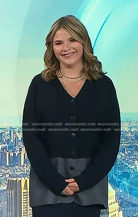 Jenna Bush Hager on Today on NBC was spotted wearing this black mixed media cardigan on Today on Oct 14 2024's episode. Jenna's Jacket is the Hybrid Knit Blazer by 3.1 Phillip Lim.