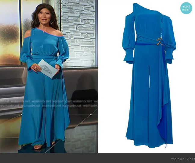 Julie Chen on Big Brother on CBS was spotted wearing this blue off shoulder jumpsuit on Big Brother on Oct 14 2024's episode. Julie's Jumpsuit is the Cosmo Jumpsuit Ibiza Blue by Estefania.