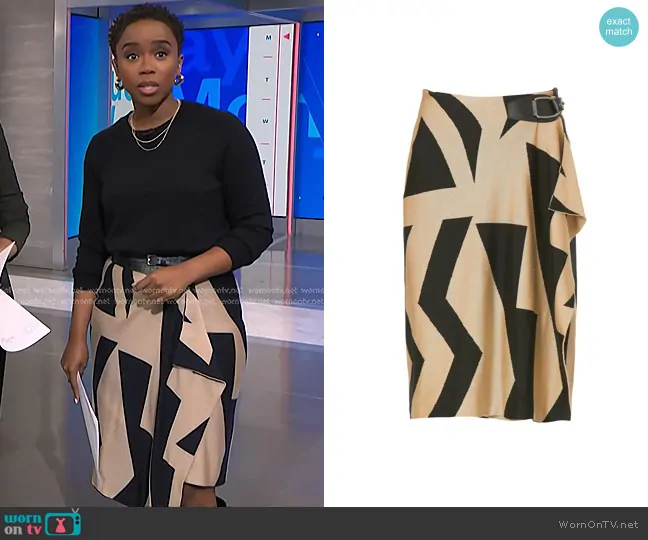 Zinhle Essamuah on NBC News Daily on NBC was spotted wearing this black and beige geometric skirt on NBC News Daily on Oct 14 2024's episode. Zinhle's Skirt is the Geo Print Faux Wrap Skirt by Lauren Ralph Lauren.