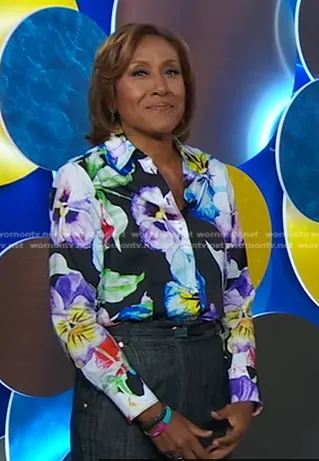 Robin Roberts on Good Morning America on ABC was spotted wearing this pansy print shirt on Good Morning America on Oct 14 2024's episode. Robin's Top is the Diane Long Sleeve Pansy Print Shirt by Hinson Wu.