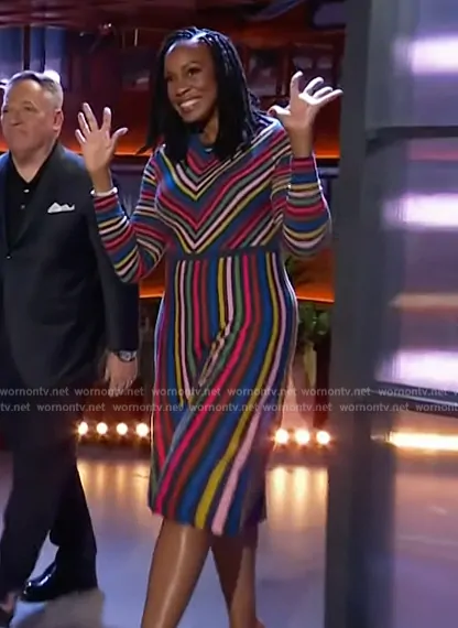 on The Kelly Clarkson Show on NBC was spotted wearing this multicolored stripe dress on The Kelly Clarkson Show on Oct 15 2024's episode. 's Dress is the Maria Knitted Midi Dress by Boden.