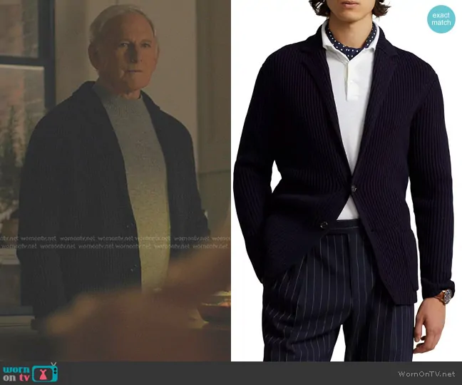 David Woodrow Randolph (played by Victor Garber) on American Horror Stories on Hulu was spotted wearing this navy ribbed cardigan and loafers on American Horror Stories on episode 'Clone' (3x06) in Oct 2024. 's Sweater is the Long-Sleeve Wool-Blend Cardigan in Navy by Polo Ralph Lauren . 's Shoes is the Luco Triomphe Loafer in Polished Bull by Celine.
