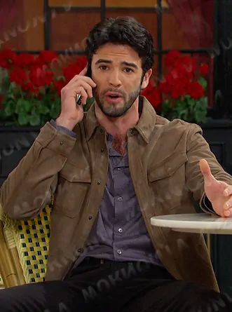 Mark Greene (played by Jonah Robinson) on Days of our Lives on Peacock was spotted wearing this brown suede shirt jacket on Days of our Lives on Oct 22 2025's episode. 's Jacket is the Izzy Suede Shirt Jacket by John Varvatos.