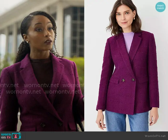 Andrea Freemann (played by Yaya DaCosta) on The Lincoln Lawyer on Netflix was spotted wearing this purple tweed blazer on The Lincoln Lawyer on episode 'Special Circumstances' (3x02) in Oct 2024. Andrea's Jacket is the The Tailored Double Breasted Long Blazer in Tweed by Ann Taylor.