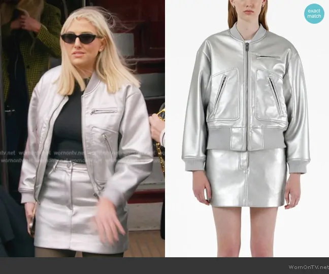 Gina Kirschenheiter on The Real Housewives of Orange County on Bravo was spotted wearing this silver metallic bomber jacket and mini skirt on The Real Housewives of Orange County on episode 'Double Decker Drama' (18x15) in Oct 2024. Gina's Jacket is the Metallic-effect bomber jacket by Apparis . Gina's Skirt is the Gretchen Metallic Skirt by Apparis.