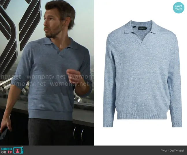 Liam Spencer (played by Scott Clifton) on The Bold and the Beautiful on CBS was spotted wearing this blue collared sweater on The Bold and the Beautiful on Oct 18 2024's episode. Liam's Sweater is the Fortrose Johnny Sweater in Ocean by Rodd & Gunn .
