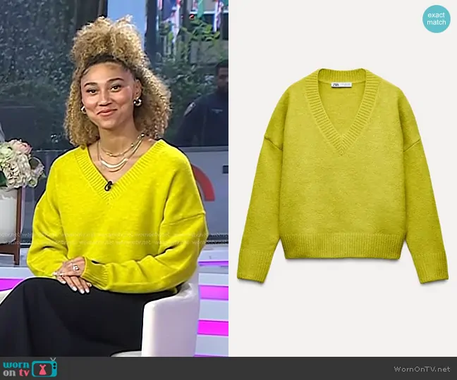 Ally Love on Today on NBC was spotted wearing this yellow v-neck sweater on Today on Jan 15 2025's episode. Ally's Sweater is the Soft Knit Sweater in Lime green by Zara.