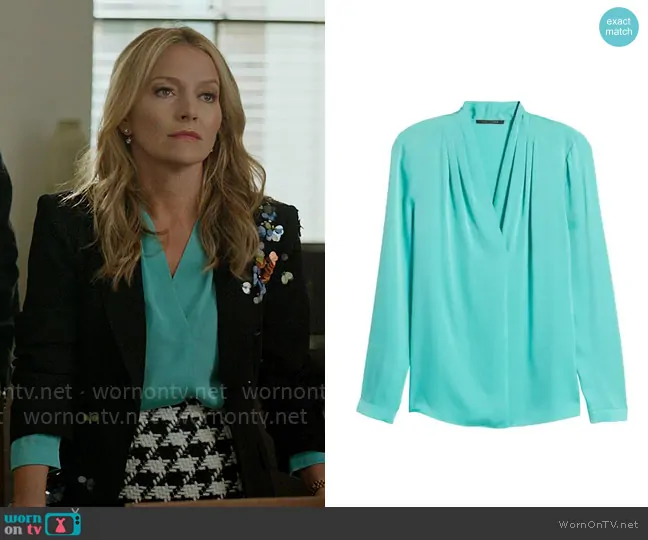 Lorna Crane (played by Becki Newton) on The Lincoln Lawyer on Netflix was spotted wearing this turquoise blouse, sequin embellished blazer and houndstooth skirt on The Lincoln Lawyer on episode 'Man on Fire' (3x06) in Oct 2024. Lorna's Top is the Nellie Blouse in Seafoam by Kobi Halperin . Lorna's Jacket is the Cheyenne Floral Pailette Blazer by Cinq a Sept . Lorna's Skirt is the Ada Black and White Houndstooth Skirt by Anine Bing.