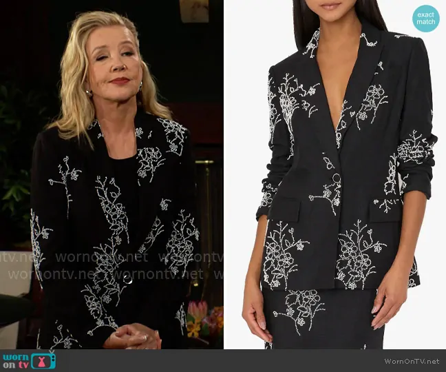 Nikki Reed Newman (played by Melody Thomas-Scott) on The Young and the Restless on CBS was spotted wearing this black beaded blazer on The Young and the Restless on Oct 21 2024's episode. Nikki's Jacket is the Alexa Beaded Embroidered Blazer by Milly .
