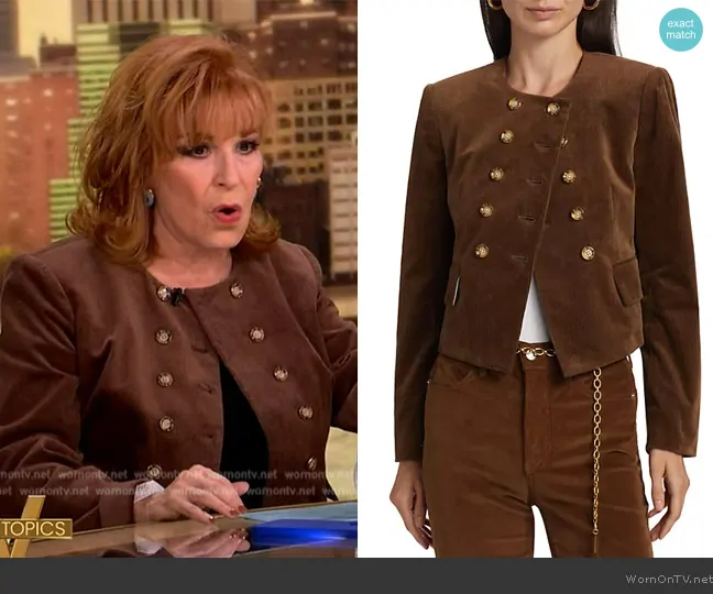 Joy Behar on The View on ABC was spotted wearing this brown double breasted jacket on The View on Oct 22 2024's episode. Joy's Jacket is the Bentley Tailored Corduroy Jacket by Veronica Beard.