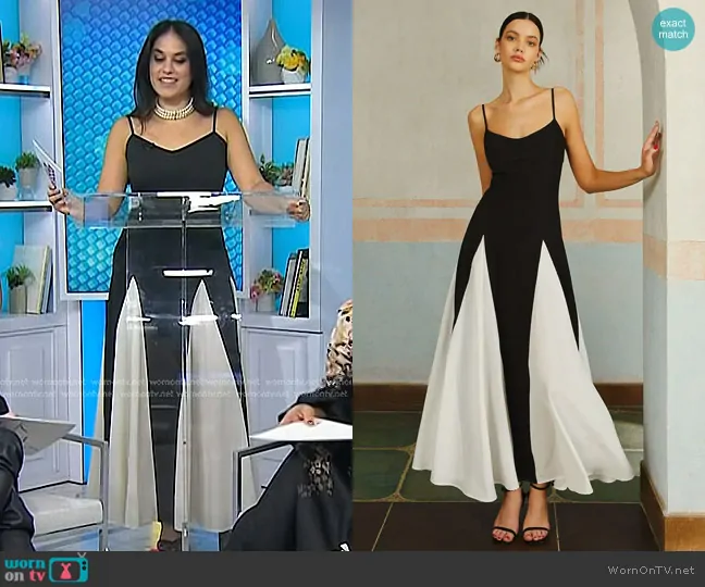 Donna Farizan on Today on NBC was spotted wearing this black colorblock midi dress on Today on Oct 22 2024's episode. Donna's Dress is the Color Block Spaghetti Strap Long Dress by Commense.