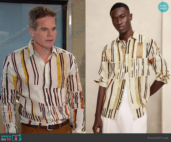 Leo Stark (played by Greg Rikaart) on Days of our Lives on Peacock was spotted wearing this white stripe shirt on Days of our Lives on Oct 23 2024's episode. Leo's Shirt is the Castello Linen Shirt in Neutral by Banana Republic.