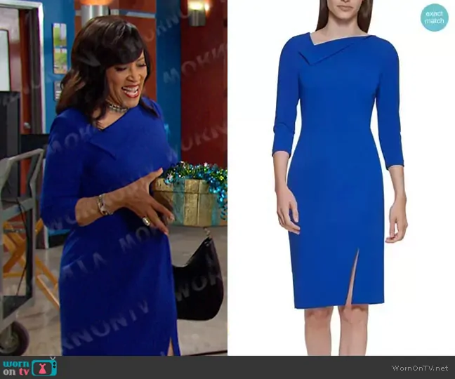 Paulina Price (played by Jackée Harry) on Days of our Lives on Peacock was spotted wearing this blue asymmetric neck dress on Days of our Lives on Oct 23 2024's episode. Paulina's Dress is the Foldover-Neck Front-Slit Sheath Dress in Regatta by Calvin Klein . Paulina's Necklace is the Gold Blue Double Row Short Strand Necklace by White House Black Market.