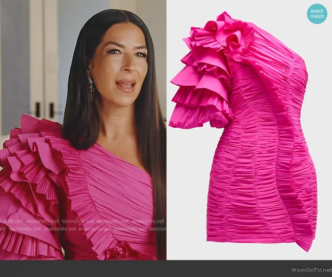 Jessel Taank on The Real Housewives of New York City on Bravo was spotted wearing this pink ruffle confessional dress on The Real Housewives of New York City on episode 'Match Point of No Return' (15x04) in Oct 2024. Jessel's Dress is the Ascot Pleated One-Shoulder Mini Dress by Acler.