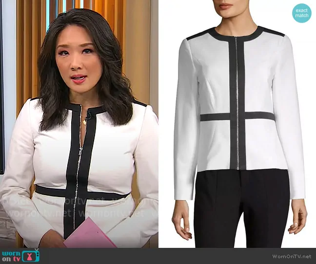 Nancy Chen on CBS Mornings on CBS was spotted wearing this white jacket with black trims on CBS Mornings on Oct 23 2024's episode. Nancy's Jacket is the Contrast Zip Jacket by Calvin Klein .