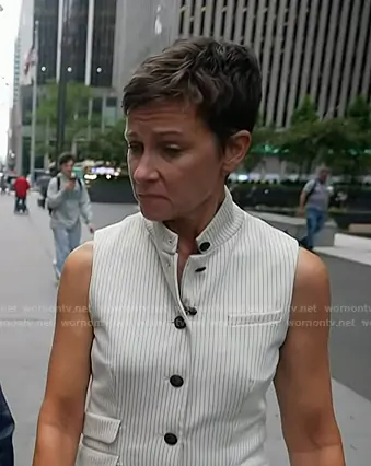 Stephanie Gosk on Today on NBC was spotted wearing this white pinstripe vest on Today on Sep 16 2025's episode. Stephanie's Vest is the Slade Ponte Vest in Ivory Stripe by Rag & Bone.