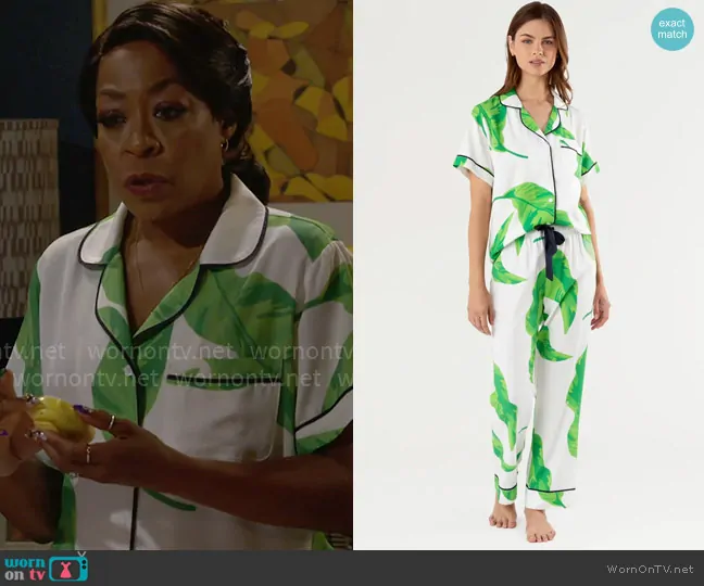 Tina Butler (played by Tichina Arnold) on The Neighborhood on CBS was spotted wearing this leaf print pajamas on The Neighborhood on episode 'Welcome to the Big Sleep' (7x02) in Oct 2024. Tina's Pajamas is the Green Banana Leaves Pajama Pants Set by Carrie Dunham.
