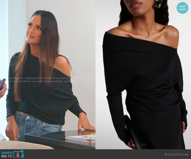 Lisa Barlow on The Real Housewives of Salt Lake City on Bravo was spotted wearing this black one off-shoulder sweater on The Real Housewives of Salt Lake City on episode 'Mafia Wives and Bad Vibes' (5x06) in Oct 2024. Lisa's Sweater is the Cashmere and Silk Sweater by Tom Ford . Lisa's Pants is the Loose-fit Ripped Jeans by Re/Done.