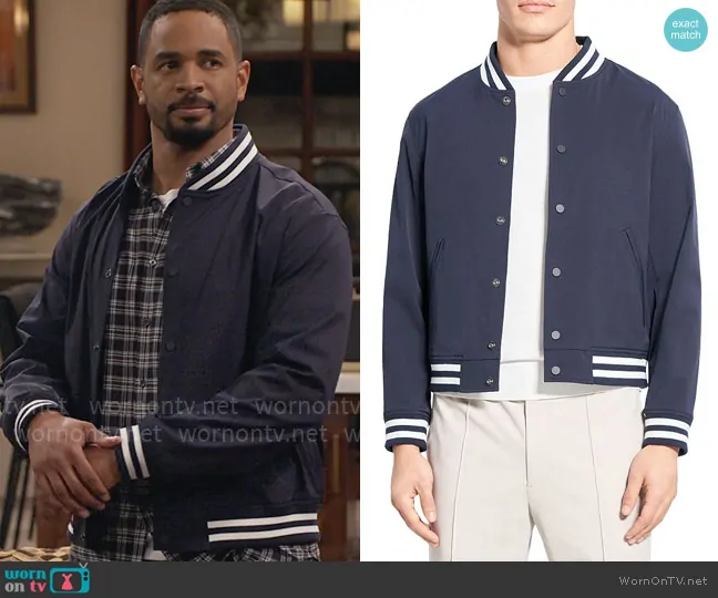 Damon (played by Damon Wayans Jr.) on Poppas House on CBS was spotted wearing this navy blue bomber jacket on Poppas House on episode 'Pilot' (1x01) in Oct 2024. Damon's Jacket is the Neoteric Varsity Jacket by Theory.