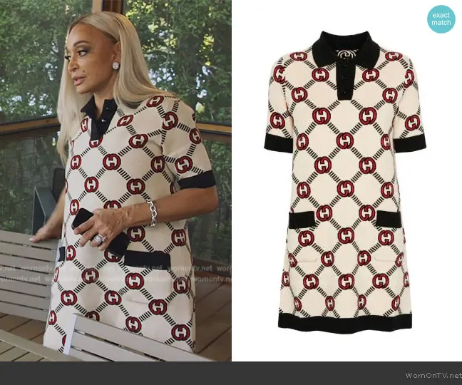 Karen Huger on The Real Housewives of Potomac on Bravo was spotted wearing this logo printed shift dress on The Real Housewives of Potomac on episode 'Bunking Beds and Butting Heads' (9x04) in Oct 2024. Karen's Dress is the Reversible Interlocking G knitted dress by Gucci.