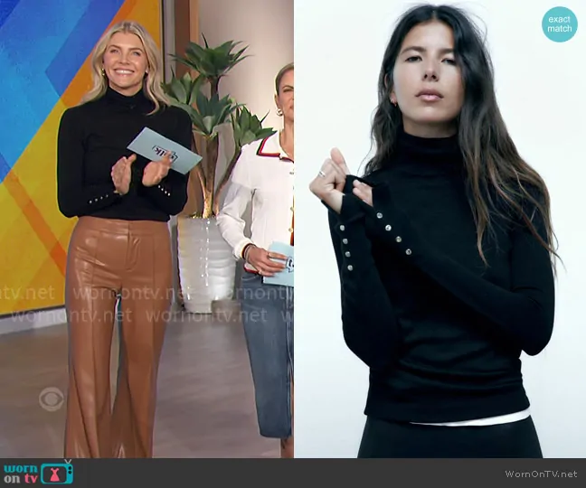 Amanda Kloots on The Talk on CBS was spotted wearing this black turtleneck top and leather pants on The Talk on Oct 29 2024's episode. Amanda's Top is the Basic High Neck Sweater by Zara . Amanda's Pants is the Dylan High Waist Wide Leg Faux Leather Pants by Alice + Olivia . Amanda's Shoes is the Marmont leather loafer pumps by Gucci.