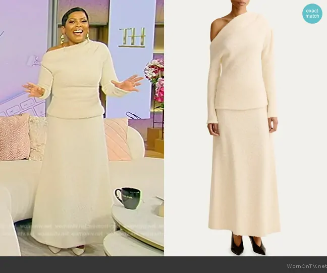 Tamron Hall on Tamron Hall Show on ABC was spotted wearing this white one shoulder knit top and skirt on Tamron Hall Show on Oct 30 2024's episode. Tamron's Top is the Bocla One-Shoulder Cutout Knit Top by Esse Studios . Tamron's Skirt is the Bocla Knit A-Line Maxi Skirt by Esse Studios.
