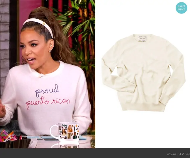 Sunny Hostin on The View on ABC was spotted wearing this custom embroidered sweater on The View on Oct 31 2024's episode. Sunny's Sweater is the Custom Womens Crewneck Sweater by Lingua Franca .