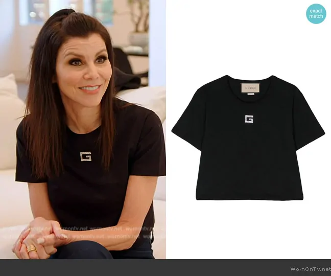 Heather Dubrow on The Real Housewives of Orange County on Bravo was spotted wearing this G crystal tee on The Real Housewives of Orange County on episode 'Unfinished Business' (18x17) in Oct 2024. Heather's Top is the Square G cotton T-shirt by Gucci.