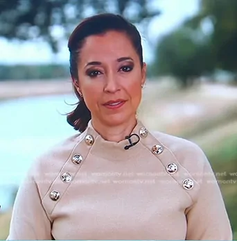 on Good Morning America on ABC was spotted wearing this beige button detail sweater on Good Morning America on Nov 01 2024's episode. 's Sweater is the Raglan Button Crew Neck Sweater in Baguette by Ann Taylor.
