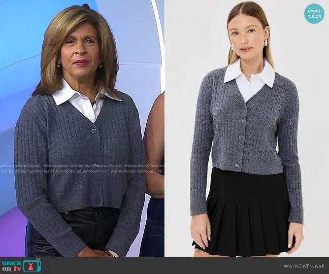 Hoda Kotb on Today on NBC was spotted wearing this white shirt and grey ribbed cardigan on Today on Nov 22 2024's episode. Hoda's Sweater is the Wallis Sweater in Charcoal/White by Staud.